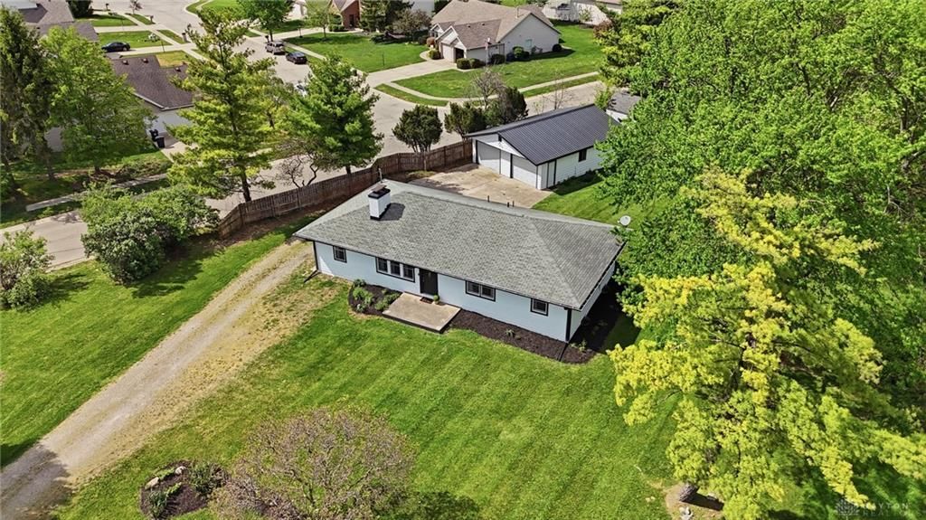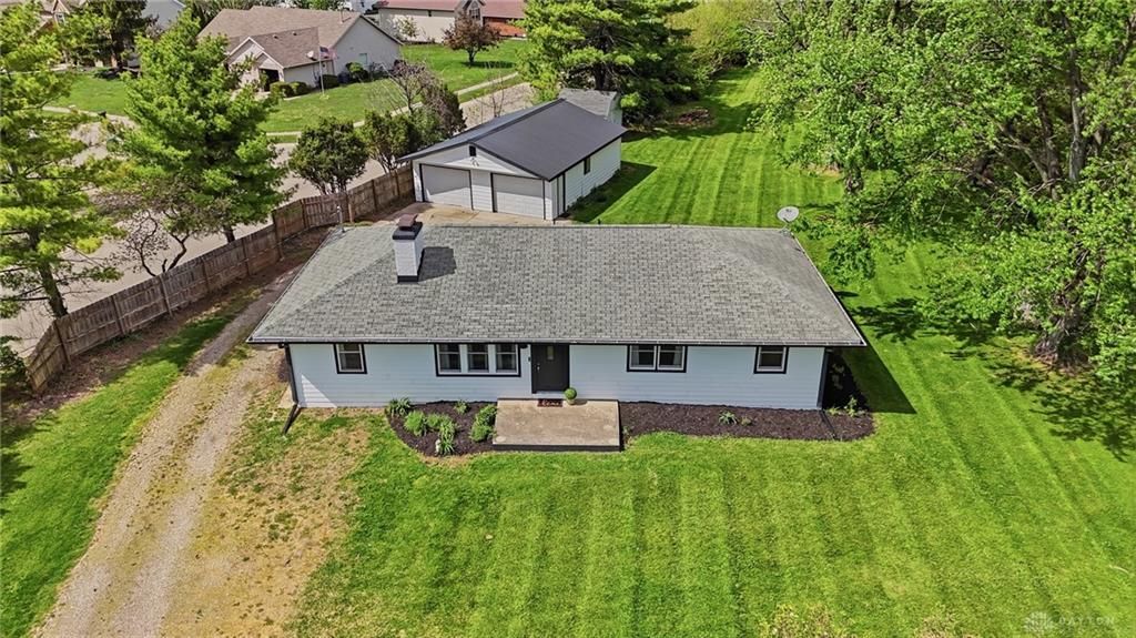 Fully renovated 4-bedroom, 2 full bath home situated on 1.1 acres in Miamisburg, just minutes from Pipestone Golf Course. Offering the perfect blend of country feel with city convenience, this charming property welcomes you with an open floor plan ideal for modern living. The spacious family room features a painted brick floor to ceiling electric fireplace, creating a warm and inviting focal point. The beautifully updated kitchen showcases white cabinetry, black granite countertops, and a custom butcher block eat-in island, along with a designated space perfect for a coffee or wine bar. Newer stainless steel appliances complete the space. The primary suite offers a fully renovated en suite bath including a gorgeous subway tile shower and a versatile bonus area that could be used for a laundry room, cozy sitting nook, or additional closet space/built-ins. Three additional bedrooms are thoughtfully positioned down the hall, providing a desirable split floor plan and sharing a second fully renovated bath. The guest bath has a tub with subway tile surround. One of the bedrooms has a large walk-in closet that would even fit a desk. Tasteful updates throughout give this home a modern farmhouse feel that is both stylish and timeless. The unfinished basement offers excellent potential for additional living space and is currently ideal for storage, a workout area, or playroom. There is a second laundry hook-up option in the basement. Outside, you’ll find a detached four-car garage with new metal roof, perfect for vehicles, a boat, lawn equipment, or recreational toys. There is a pond on the back of the lot which is shared with the neighboring lot. Conveniently located just minutes from Austin Landing with shopping, dining, groceries, and easy access to I-75, as well as nearby parks and bike paths. Utilities are: well water (what a savings), propane and septic. This property truly has it all—schedule your showing today before you miss the opportunity to call this one home!